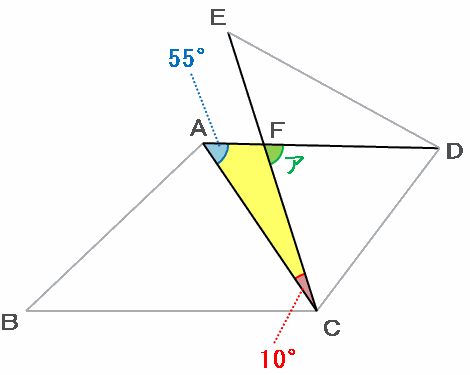 求める角アは、下の図を見れば分かるように三角形ACFの外角になっているので、その大きさは角FACと角ACFを足せば求められます。