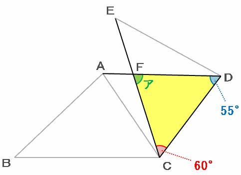 次の図のように三角形FCDに注目して、180-(60+55)=65度と求めるのもOKです。