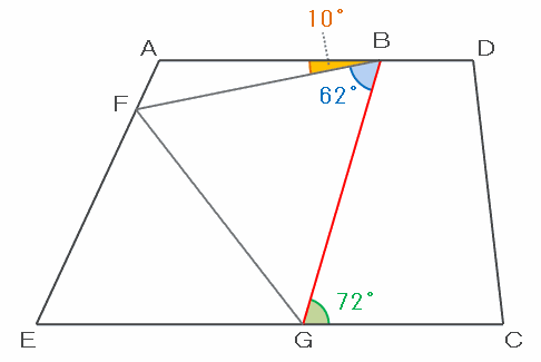 また、角FBGは62度なので、角ABFの大きさは72-62=10度になります。