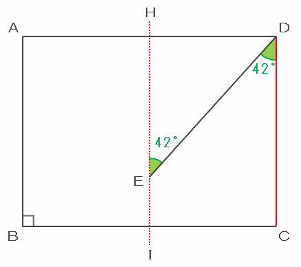 上の図の角EDCの大きさは42度で、それが辺DGによって2等分されているので、角EDGとCDGの大きさはどちらも42÷2=21度です。