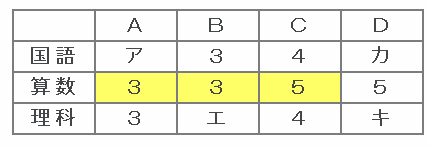 次の表はAさん、Bさん、Cさん、Dさん4人の国語、算数、理科の5段階(1から5まで)の成績表です。①から⑧までの条件があるとき、表のアからキの部分に入る数字を答えなさい。