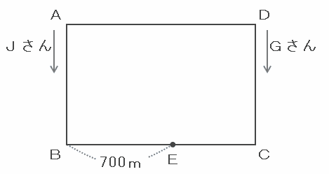 次の図のような、たてと横の長さの比が3:5の長方形の形をしたランニングコースを、JさんはA地点から反時計回りに、GさんはD地点から時計回りに同時に出発し、2周しました。