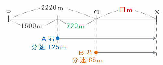 B君が18分間で進む距離(上の図のQX間)は85×18=1530mなので、PからXまでの距離は、2220+1530=3750(m)になります。