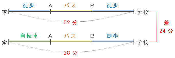 したがって、52-28=24分の時間差は、家からA地までを徒歩で進むか自転車で進むかの違いによって生じていることが分かります。