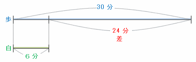 また、徒歩だとそれよりも24分多くかかるので、家からA地まで歩くと6+24=30分かかります。