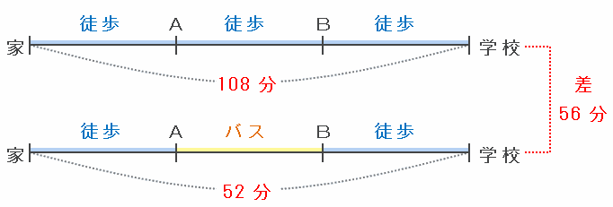 したがって、108-52=56分の時間差は、A地からB地までを徒歩で進むかバスで進むかの違いによって生じていることが分かります。
