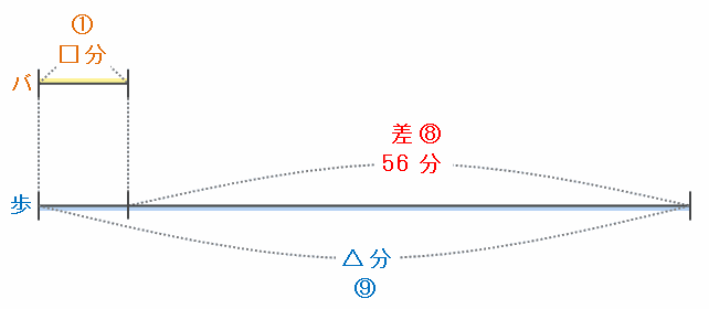 したがって、バスがA地からB地へ進むのにかかる時間を比の①とおくと、歩いてA地からB地へ進むのにかかる時間は比の⑨と表せるので、2つの進み方の違いによって生じた時間差である56分は比の⑨-①=⑧にあたることが分かります。