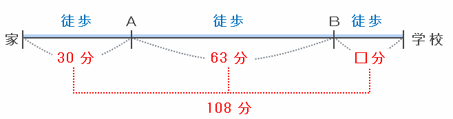 ので、B地から学校までは徒歩で108-(30+63)=15分かかります。