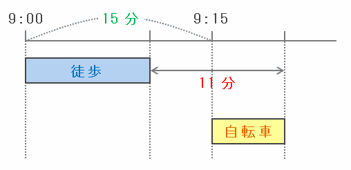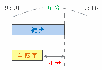 つまり次の図のように、もし紀子さんが予定通り9時ちょうどに家を出発し、自転車に乗ってA駅へ向かったら、徒歩で進んだ場合よりも4分早くA駅に到着します。