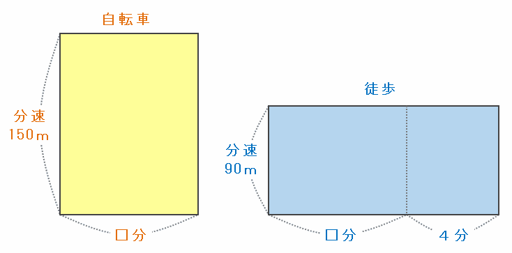 また、紀子さんが自転車で進むときの速さは分速150m、歩いて進むときの速さは分速90mなので、長方形の縦じくを速さ、横じくを時間として、家からA駅まで「自転車で進んだ場合」と「歩いて進んだ場合」を図に表すと次のようになります。