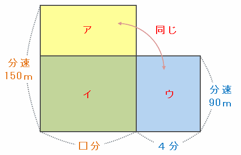 上の図のアの長方形は、縦じくの長さが150-90=分速60mで、面積(というか距離)はウと同じく90×4=360mなので、アの横じくの長さ(図の□分)は360÷60=6分間です。