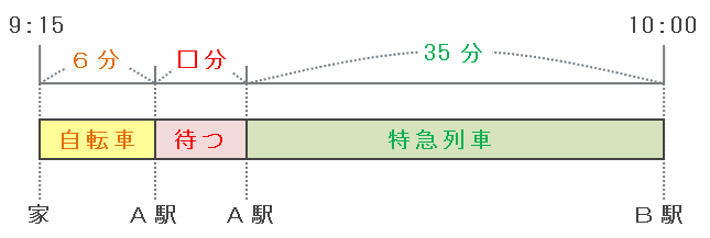 したがって、特急列車がA駅を出発したのは、紀子さんがA駅に到着してから45-(6+35)=4分後になります。
