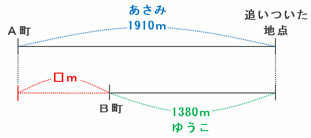 ここまでの流れを次の図のようにまとめると、あさみさんはA町から追いついた地点まで1910m、そこからC町までは1200m進んだので、A町からC町までの距離は1910+1200=3110mになります。