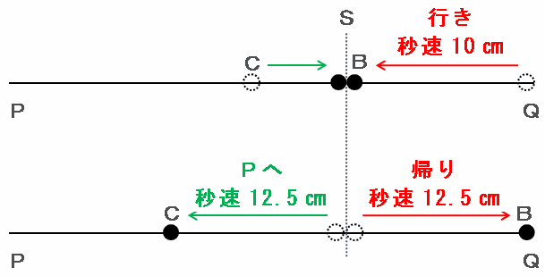 点Bは次の図のように、秒速15㎝で進んできた点CとS地点でぶつかるまで秒速10㎝で進み、そこではね返された後はQ地点へ向かって(15+10)÷2=秒速12.5㎝で戻ります。