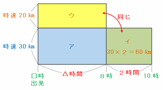 また、ウの面積もイと同じく60㎞なので、上の図の△時間には60÷20=3時間があてはまります。