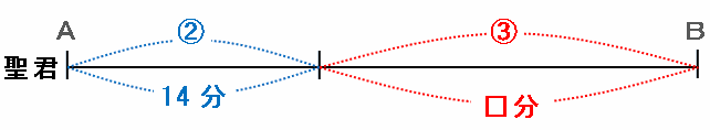 聖君は②の距離を進むのに14分かかるので、①の距離を進むのにかかる時間は14÷②=7分、そして③の距離を進むのにかかる時間は7×③=21分になります。