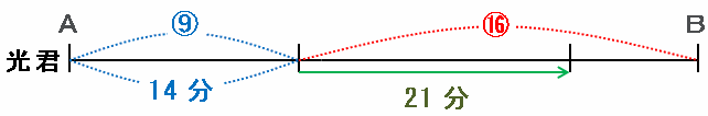 光君は⑨の距離を14分で進むので、21分間で進む距離を□とおくと、9:14分=□:21分という比に表せます。