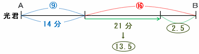 このとき、□は9×21÷14=13.5なので、残りの距離の比は16-13.5=2.5になります(次の図)。