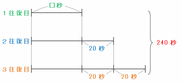 B君が1往復目にかかった時間を□秒とおき、2往復目と3往復目にかかった時間も含めて次のような線分図に表してみると、B君が1往復目にかかった時間は(240-20×3)÷3=60秒になります。