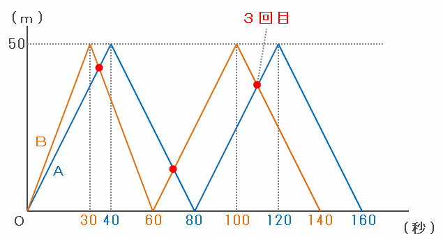 また、B君は1往復目に60秒、2往復目に60+20=80秒、そして3往復目に80+20=100秒かかったので、2人が50mプールを往復する様子をグラフに表すと次のようになります。