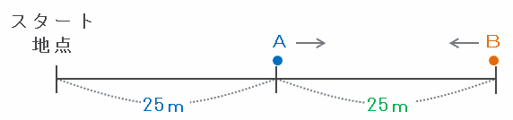 つまり、スタートから100秒後の2人の位置関係を図に表すと次のようになるので、2人が3回目にすれ違うのは、下の図から25÷(1.25+1.25)=10秒後です。