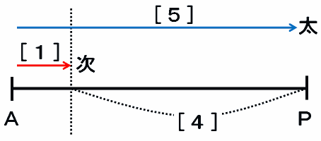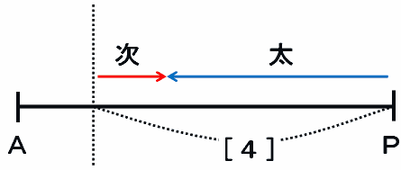 2人の速さの比は、太:次=5:1なので、太郎君がP地点に着くまでに進んだきょりを[5]とおくと、その間に次郎君が進んだきょりは[1]、そして2人のきょりの差は[5]-[1]=[4]と表せます(図1)。