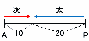 その後、太郎君はA町までの残りである10のきょりを進みますが、その間に次郎君は、10÷5=2のきょりを進みます(図4)。