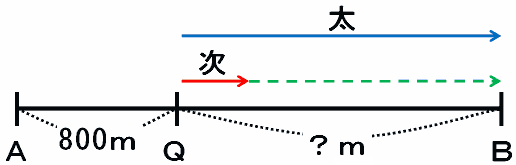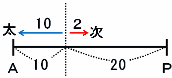 ※ 2人が同じ時間で進むきょりの比は太:次=5:1だから、太郎君が10進むなら、次郎君は2進むはず。