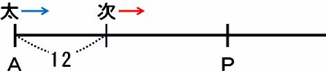 A町に着いた太郎君が次郎君を追いかけ始めるとき、2人のきょりの差は10+2=12になっています