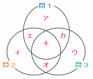 ウオカキの人数は18人、そしてウオカの人数は15人なので、キ(全問正解した人)の人数は18-15=3人です。