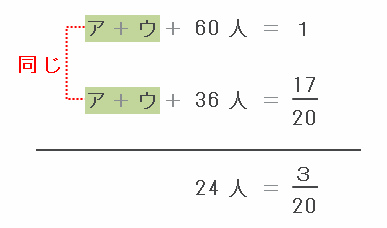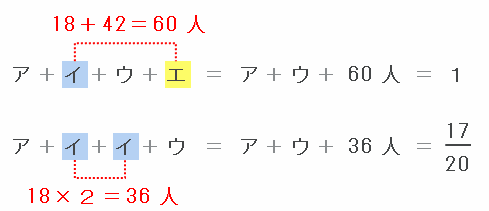 ・ア+イ+イ+ウ=20分の17→イが2つで18×2=36人なので、ア+ウ+36人=20分の17
