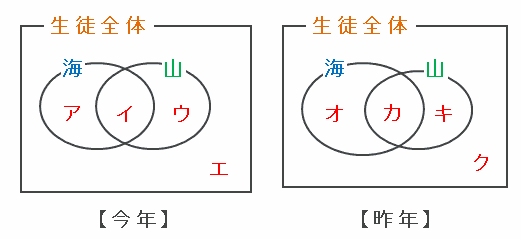 夏に海や山へ行った生徒の分布を、次のように「今年の夏」と「昨年の夏」の2つに分けてベン図に表してみると、