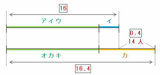 また、「アイイウ」を「アイウ+イ」、「オカカキ」を「オカキ+カ」のように分け、その2つを次のような線分図に表して比べてみたとき、この図の「アイウ」と「オカキ」の人数は同じなので、比の差である0.4は、イとカの人数差である14人にあたることが分かります。