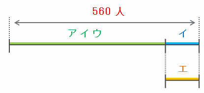 「アイイウ」をさっきと同じように「アイウ+イ」と分け、次のような線分図に表してみたとき、イとエの人数は同じなので、「アイウエ」と「アイウ+イ」の人数は等しいことが分かります。