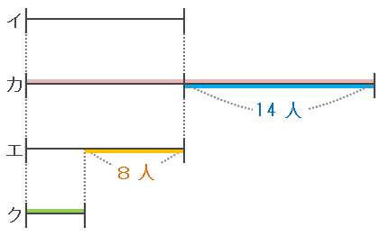 上の図を見れば分かるように、エはカよりも14人少なく、クはエよりも8人少ないので、クはカよりも14+8=22人少ないです。