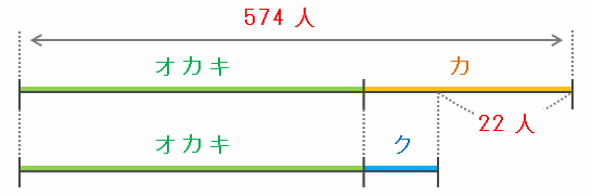 上の図のクはカよりも22人少ないので、「オカキク」の人数は「オカキ+カ」の人数から22人を引けば求められます。