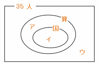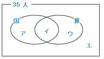 その場合、上のベン図のアイウ=35人、アイ=18人、イウ=25人なので、イにあてはまる人数は18+25-35=8人になります。