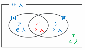 次のベン図のイが12人なので、アは18-12=6人、ウは25-12=13人、そしてエは35-(6+12+13)=4人であることが分かります。