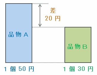 たとえば問題文に「1個50円の品物Aと1個30円の品物Bを合わせて○個買ったら・・・」とある場合、品物AとBを1個交換するごとに、合計金額は次の図のように50-30=20円ずつ変わっていくので、「とにかく差で割ればOK」的なノリでも案外普通に解けます。