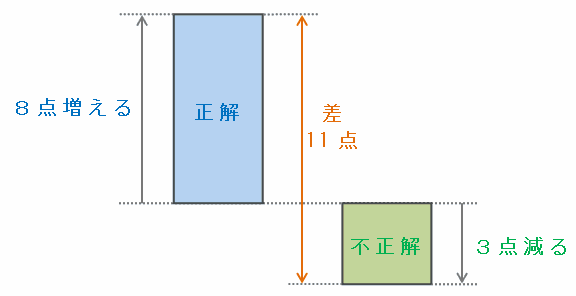 しかしこの問題の場合、1問正解すると8点プラス、1問間違えると3点マイナスなので、「1問正解」が「1問不正解」に変わるごとに、テストの合計点は次の図のように8+3=11点ずつ変わっていきます。