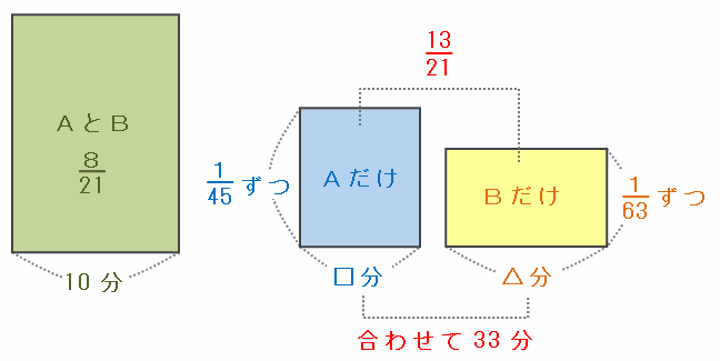 この問題で求めたいのはA管だけを使った時間(上の図の□分)ですが、AとBそれぞれの管から1分間に入る水の量、残りの時間(33分)、満水までの残りの水量(21分の13)がすべて分かっているので、つるかめ算の公式を利用できます。