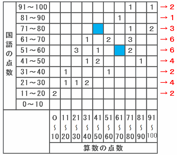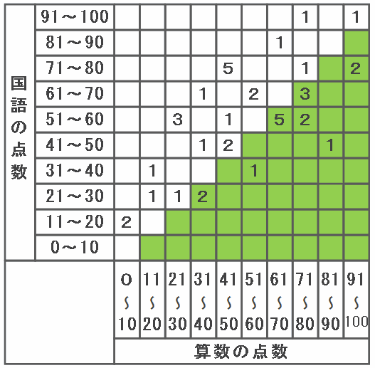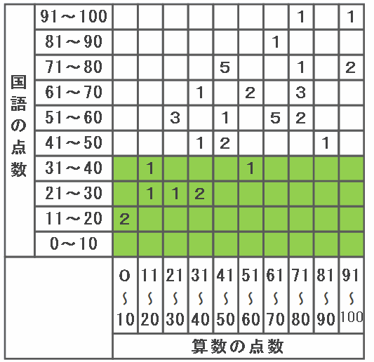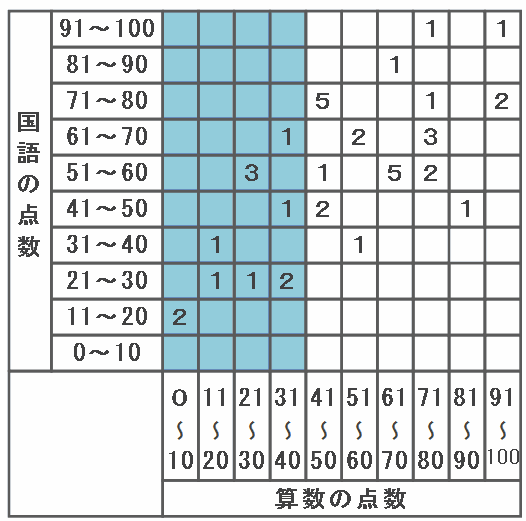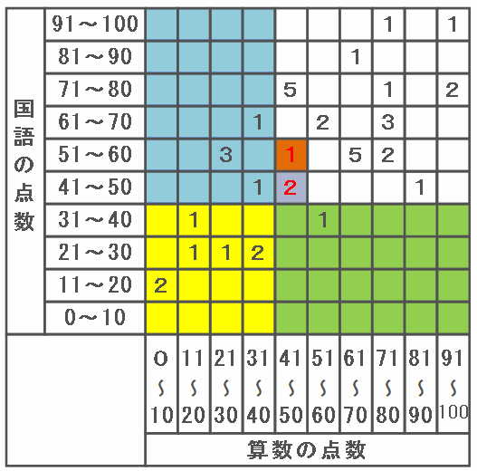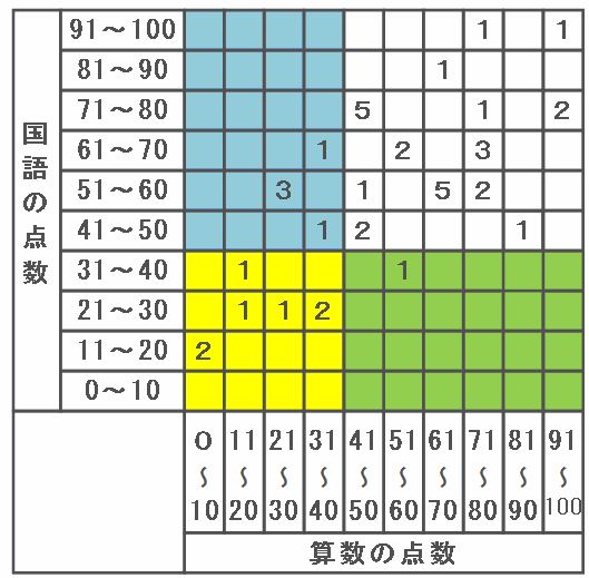 下の表は、あるクラスの児童40人の算数と国語の点数をまとめたものです。表の中の黄色い「1」は算数の得点が81~90点、国語の点数が41~50点の児童が1人いることを表しています。