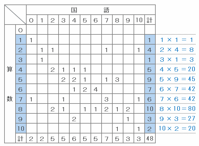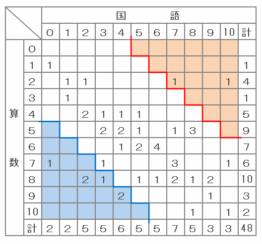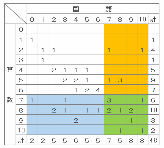 上の図の赤い部分には1+1=2人、そして青い部分には1+2+1+2=6人いるので、国語と算数の得点が5点差以上の生徒は全部で2+6=8人います。
