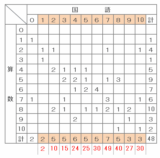 次は下の図のように、国語の得点ごとの合計点をそれぞれ計算して書き込んでみます。