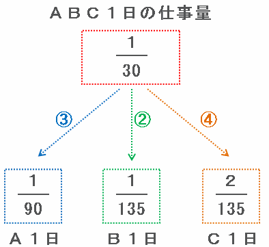 ・B1日の仕事量→(30分の1)×(9分の2)=135分の1