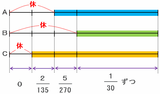 次のように、Aは最初の2日間、Bは最初の3日間、そしてCは最初の日だけ休んだと考えて線分図に表してみます。