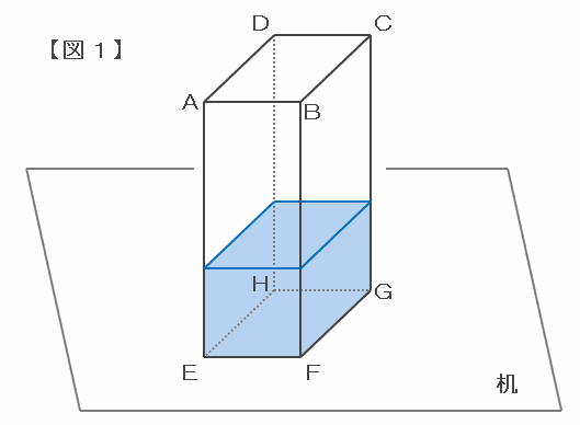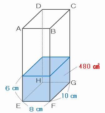 次の図のように、容器の面EFGHが底面になっているときは水の深さが6㎝なので、容器に入っている水の量は10×8×6=480㎤です。