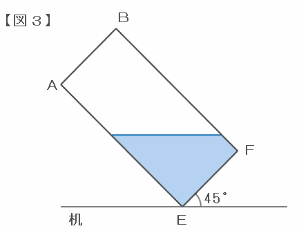 上の図で容器をさらに左へ傾けると水面が点Fよりも下になり、EFGHの中で水にぬれない部分が出てくるので、この求め方が使えなくなります。