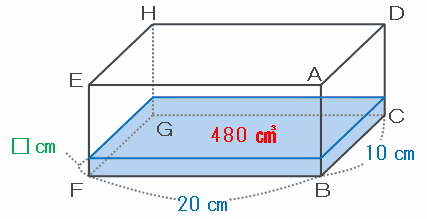 また、そのときの底面積は10×20=200㎠なので、水の深さは480÷200=2.4㎝になります。