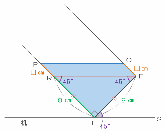 上の図の直角二等辺三角形EFRは辺REとFEの長さが等しいので、辺REはFEと同じく8㎝です。